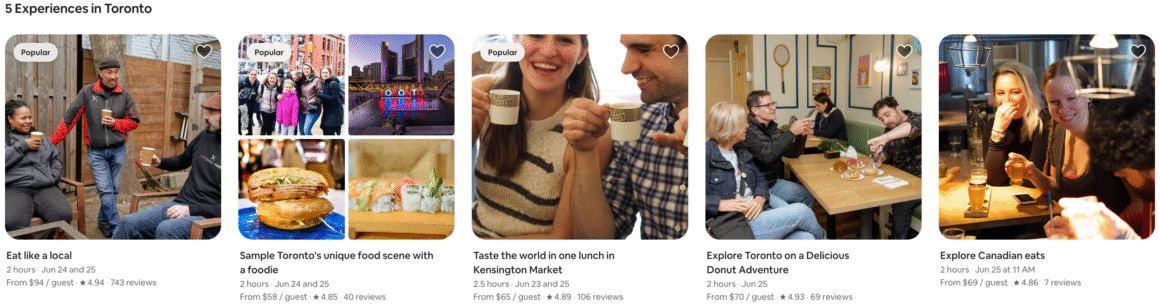 Airbnb Experiences has a handful of local-led food tours, ranging from neighborhood-specific bites to niche themes (yes, there’s one dedicated entirely to donuts 🍩). Whether you want to explore Kensington Market’s multicultural eats or sample modern Canadian cuisine in the Financial District, there’s a tour to match your mood.